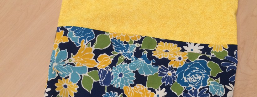 This project is a simple tote bag with two different fabrics on the outside and a single-fabric lining. It only took a couple hours and I’m sure would be faster if I made another one. I chose bright, summery fabrics for this project:  yellow, blue, and white flowers on a navy blue background for the main color, and yellow with subtle little white leaves for the contrast color and the lining.