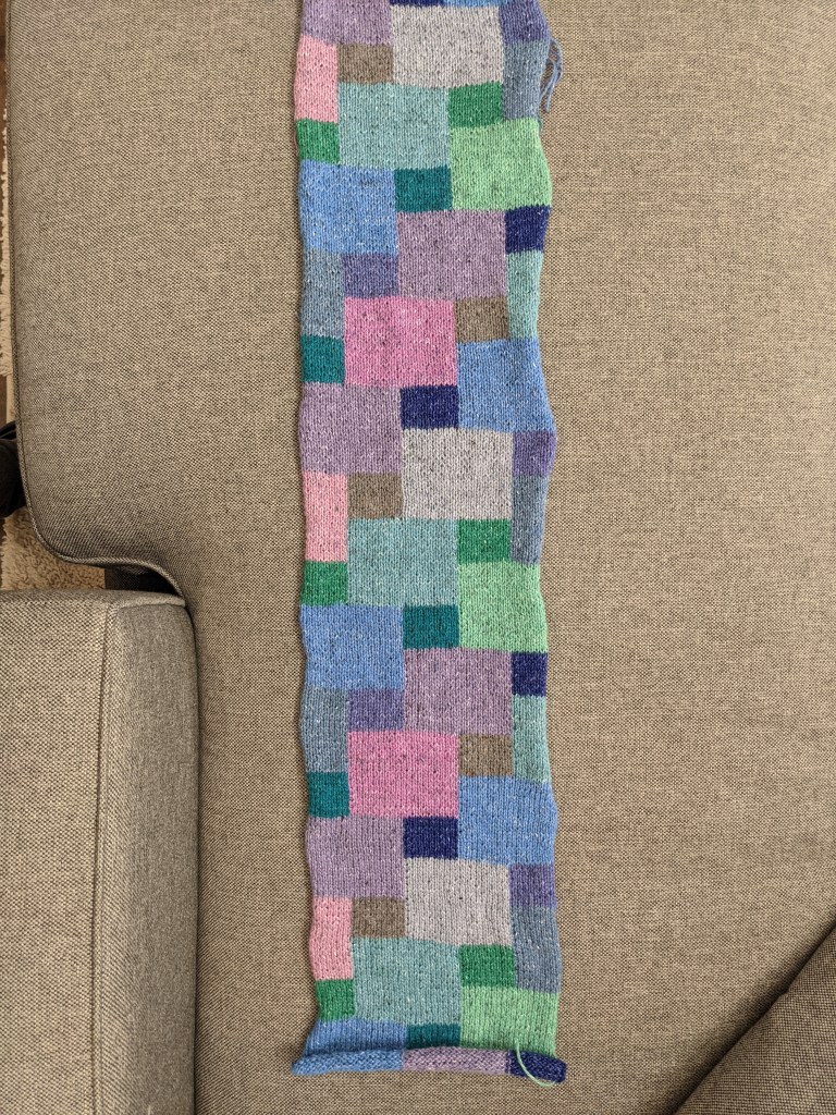 This project was a fun introduction to the log cabin knitting approach. It was nice to try a sampling of different log cabin patterns without committing to a large project. Now that I have tried it, though, I have my eye on some beautiful larger projects like the Fussy Cuts Blanket, which uses the amazing multicolor Noro Silk Garden yarn. Maybe next year?