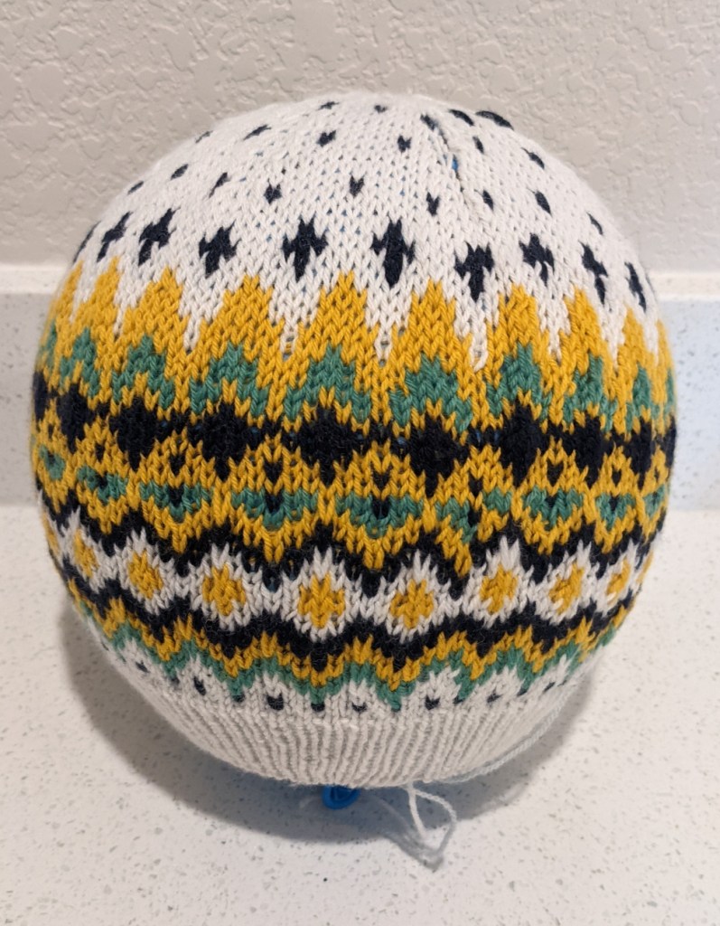 This one starts in the middle section. You work all the white rows, then bind off, leaving the last stitch live. Then you turn the piece and pick up stitches along the edge, knitting the blue square on the right. Next comes the smaller gray section on top. You just keep adding on sections of stitches until it’s the right size. But how do you know what is a good size to make each section?